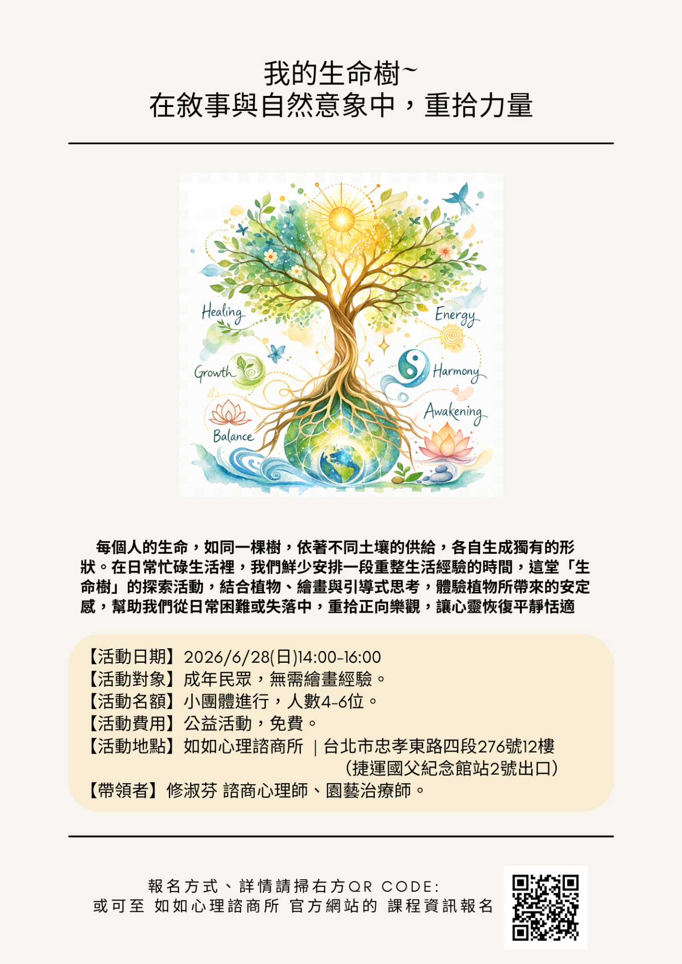 本活動適合對主題有興趣、願意投入時間練習與交流的學員;若您目前身心狀態不穩定、正在接受密集醫療或心理治療,建議先與專業人員討論是否適合參與,以確保您的安全與舒適。我們尊重每一位參與者的步調,您可以依照自己的狀況決定是否報名。